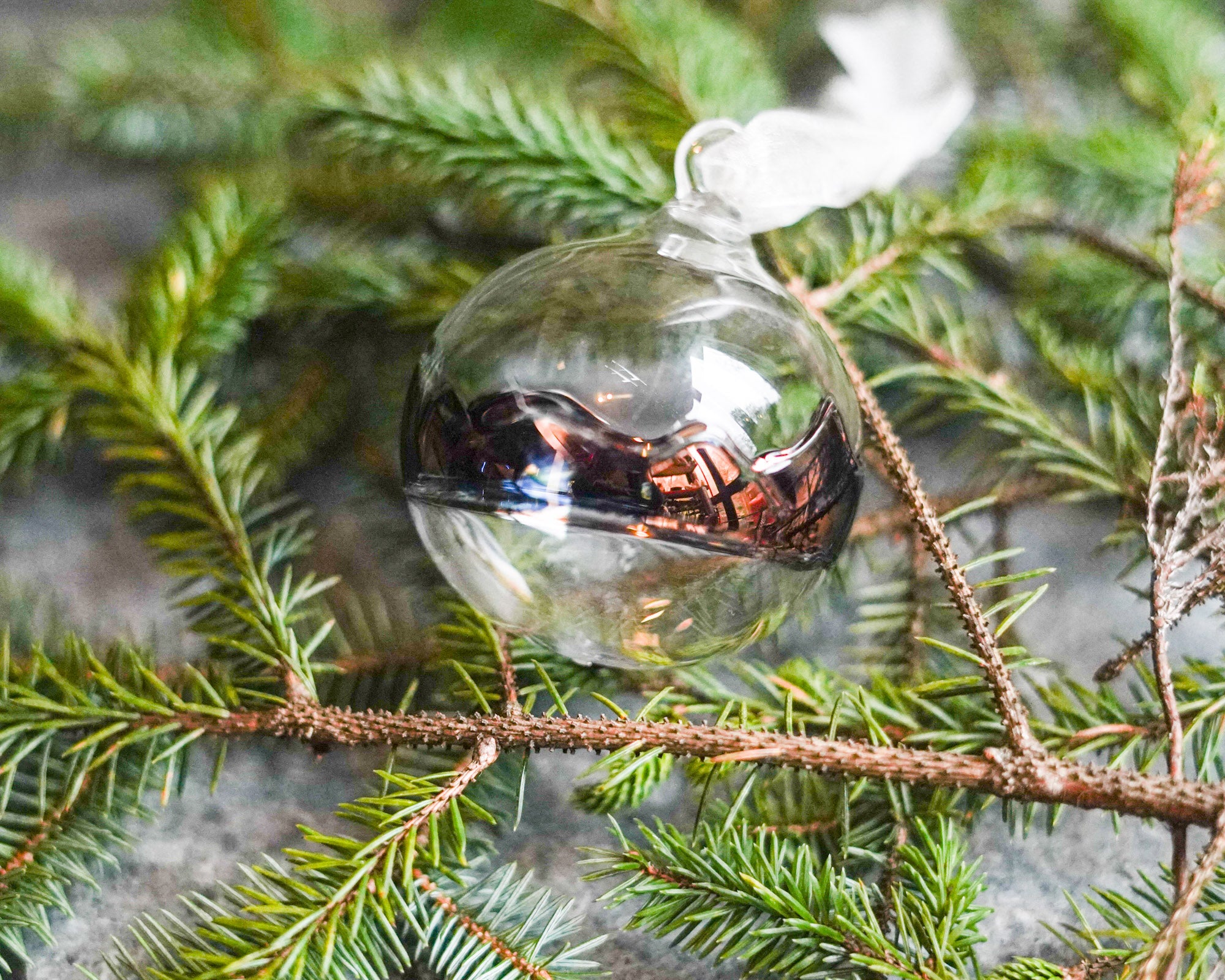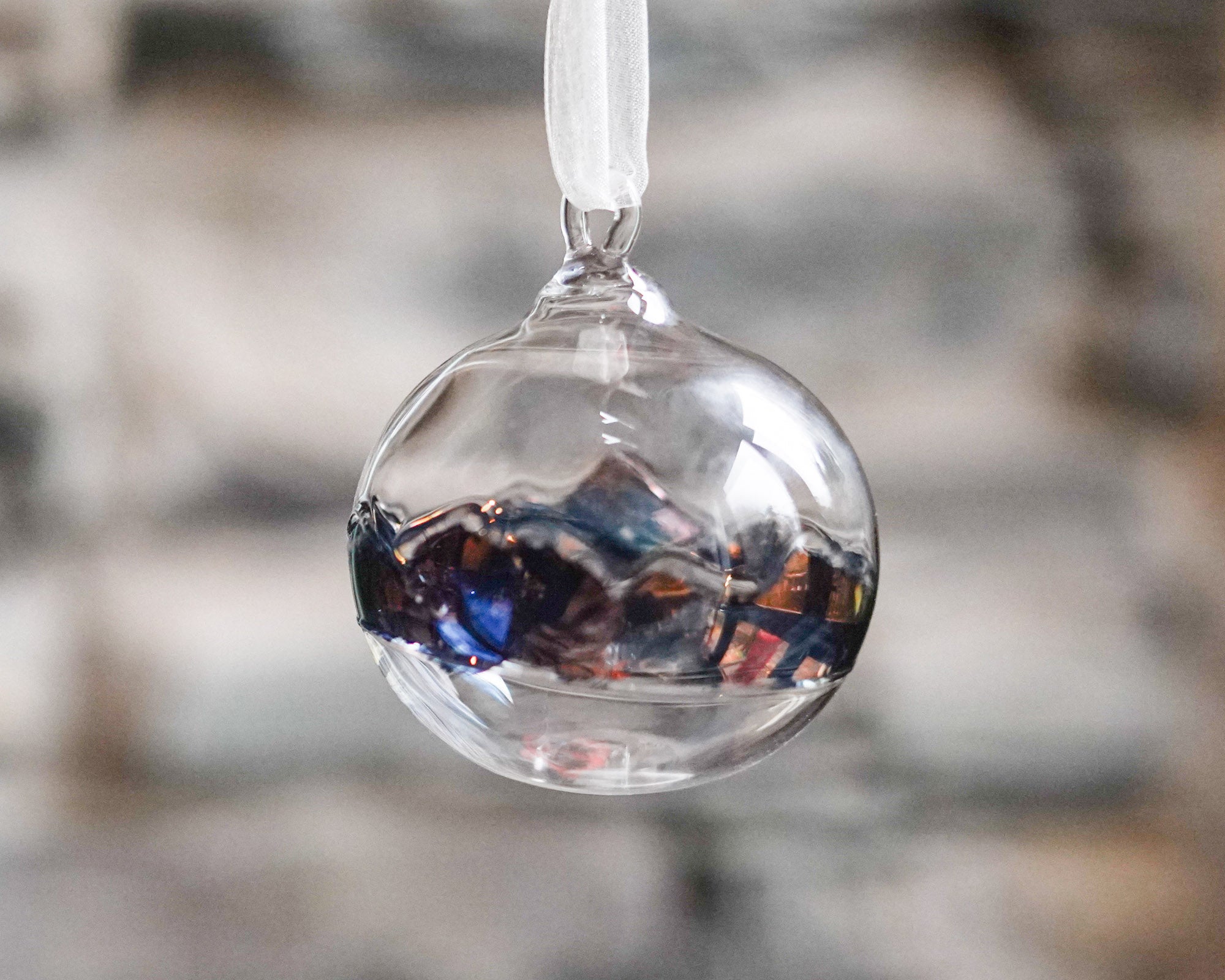 This hand blown glass bauble has been made in the heart of the English Lake District and features outlines of Lakeland hills and valleys, hand drawn into the glass during the blowing process. These hills have then been painted with copper lustre which is then fired onto the glass, creating a gorgeous two-tone effect, reflecting a shiny copper but transmitting a cobalt blue. The result is a unique and highly individual bauble filled with the character and soul of the Lakes.