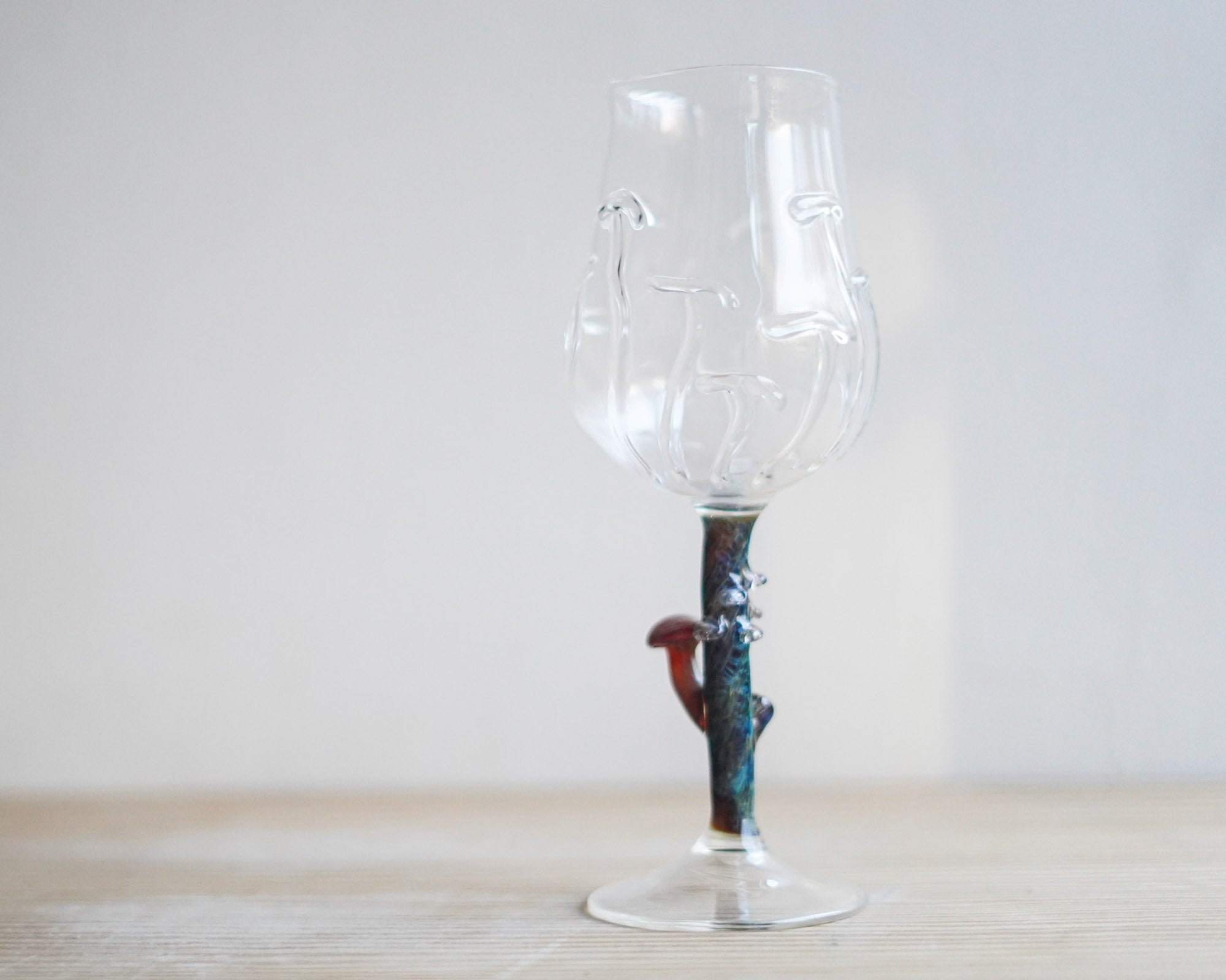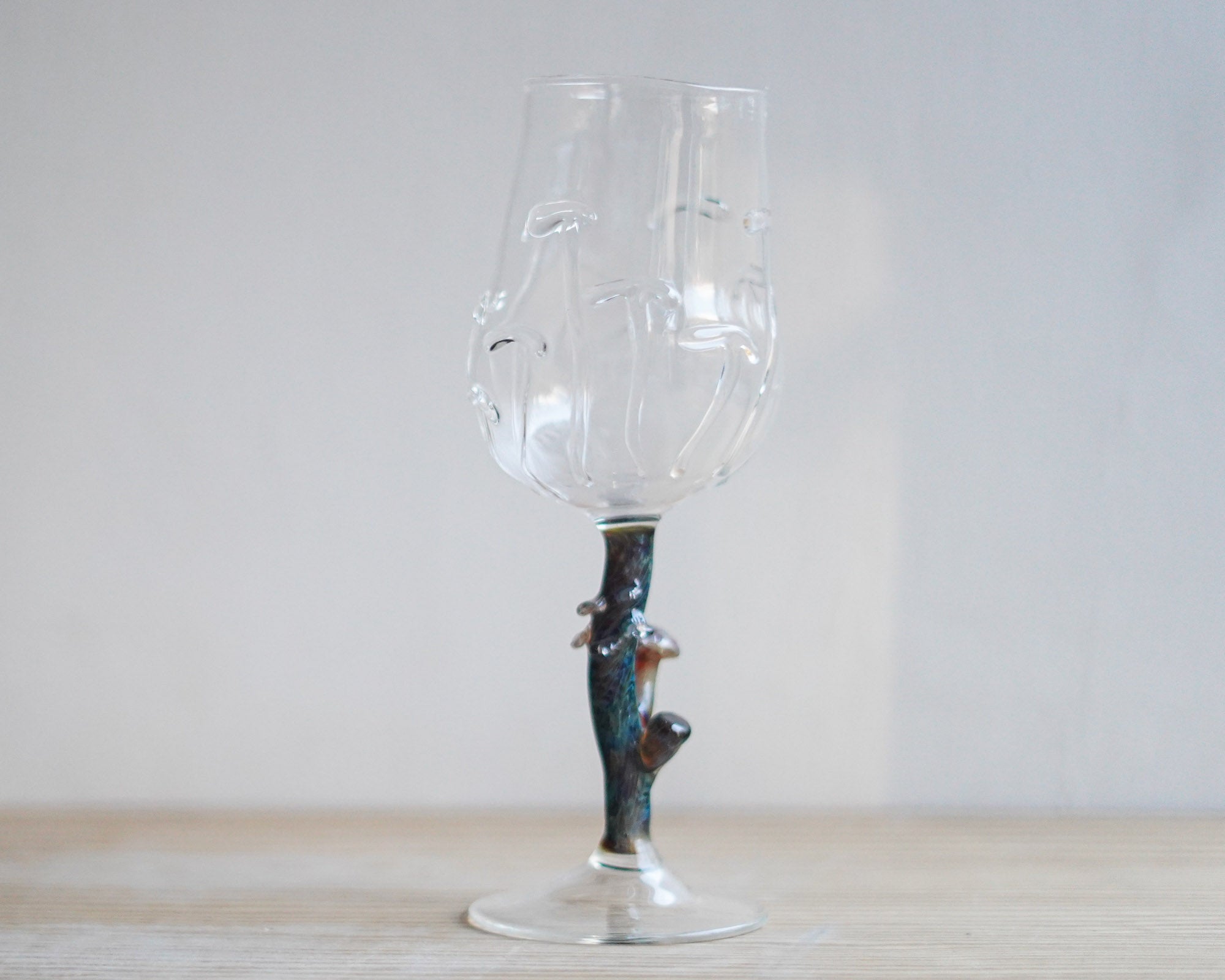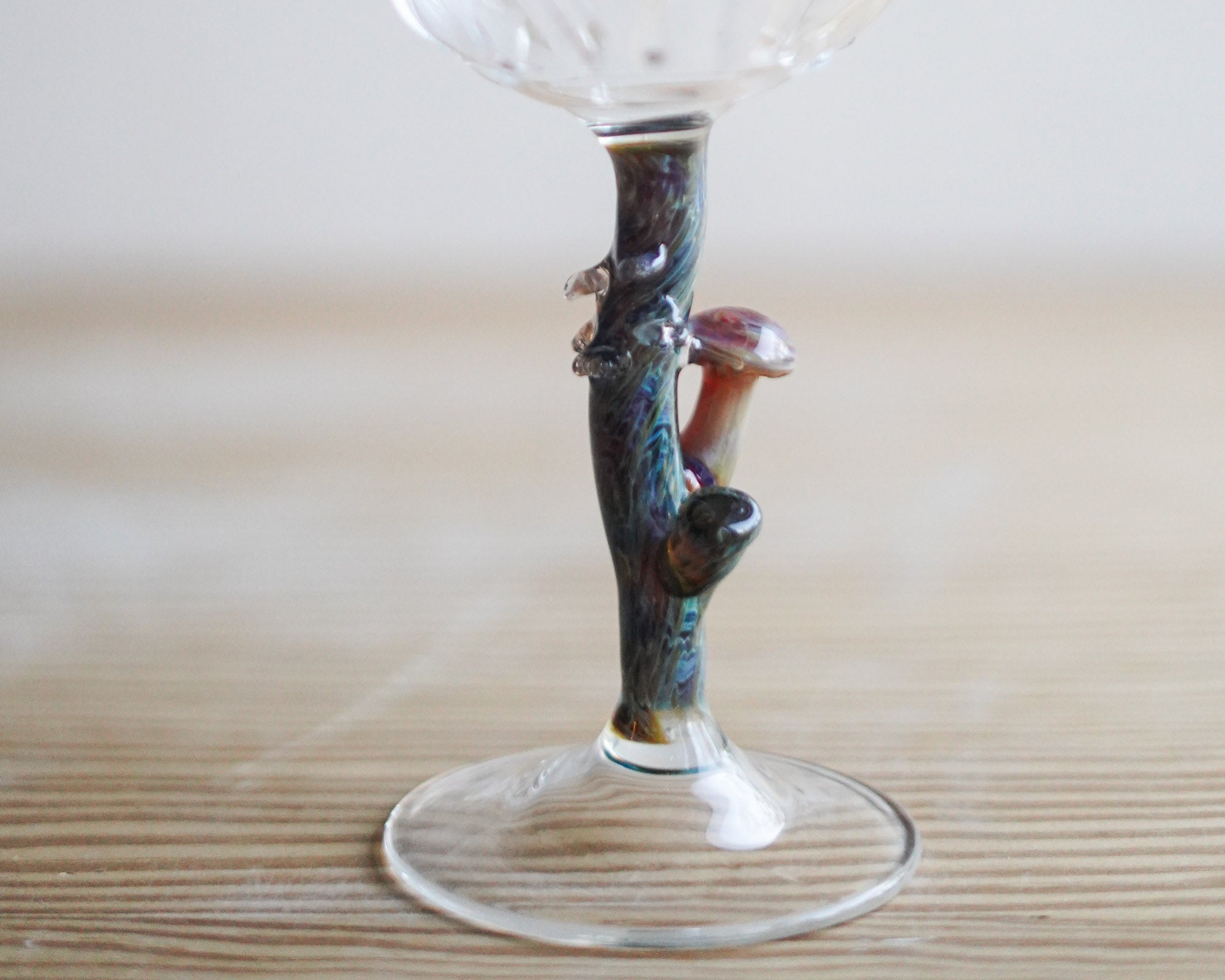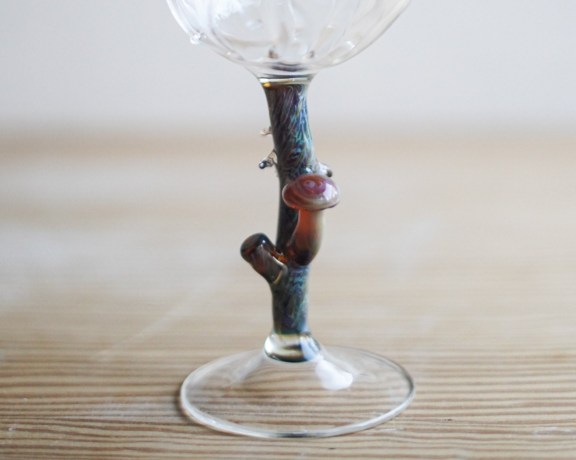 The goblet of this glass has a mushroom design hand-drawn into the goblet during the blowing process. The stem depicts a moss-coloured log, little jelly ears and a small mushroom.