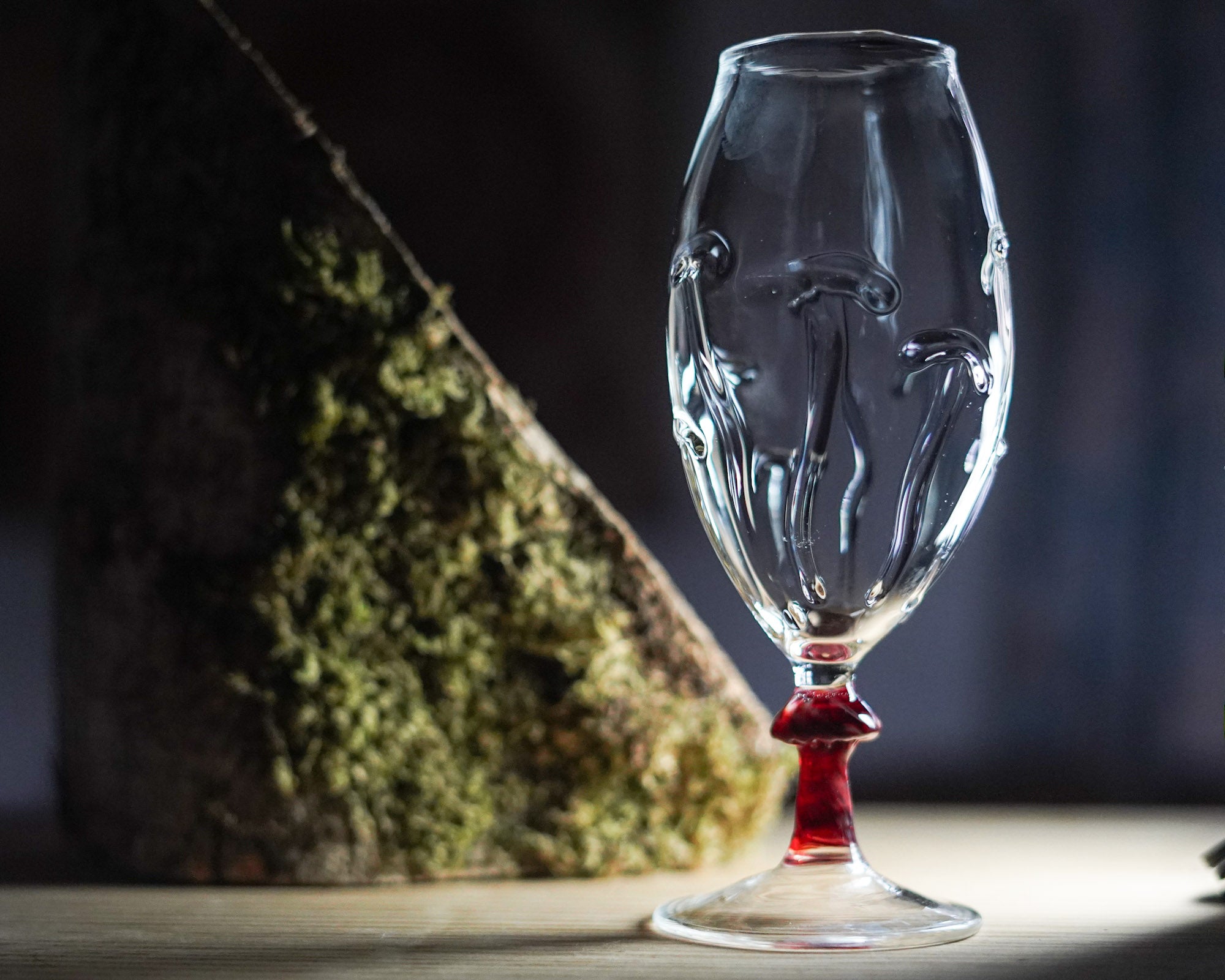 Handblown in the heart of the Lake District, this one-off glass features a hand-coloured and sculpted red mushroom stem, with my 'tall mushrooms' design in clear glass, hand drawn on the goblet during the blowing process.