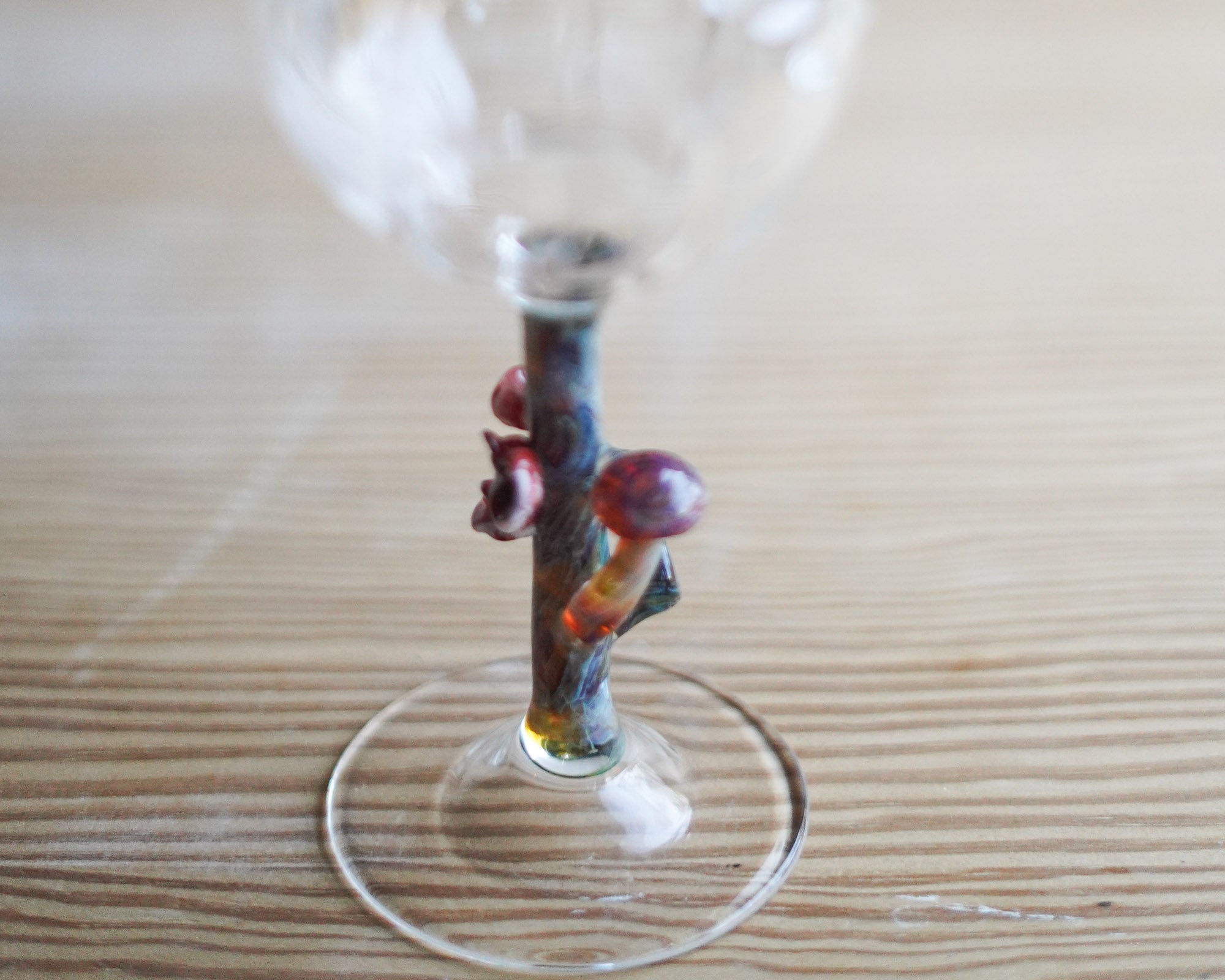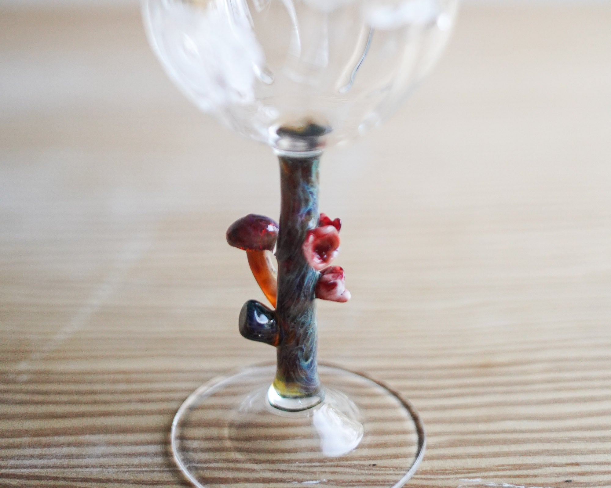 The goblet of this glass has a mushroom design hand-drawn into the goblet during the blowing process. The stem depicts a moss-coloured log, with scarlet elf caps and a small mushroom.