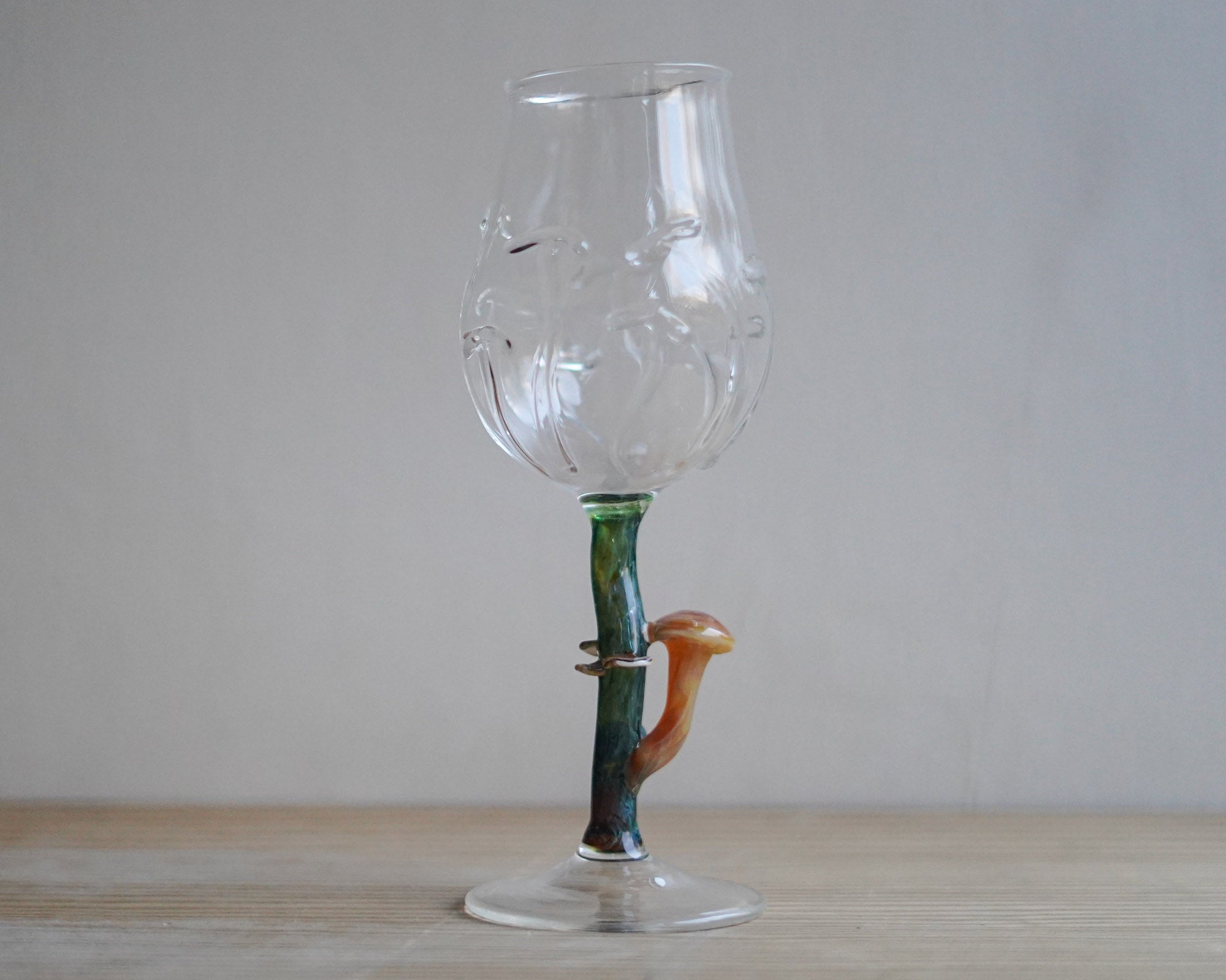 The goblet of this glass has a mushroom design hand-drawn into the goblet during the blowing process. The stem depicts a moss-coloured log, with Turkey tail fungi and a small mushroom.